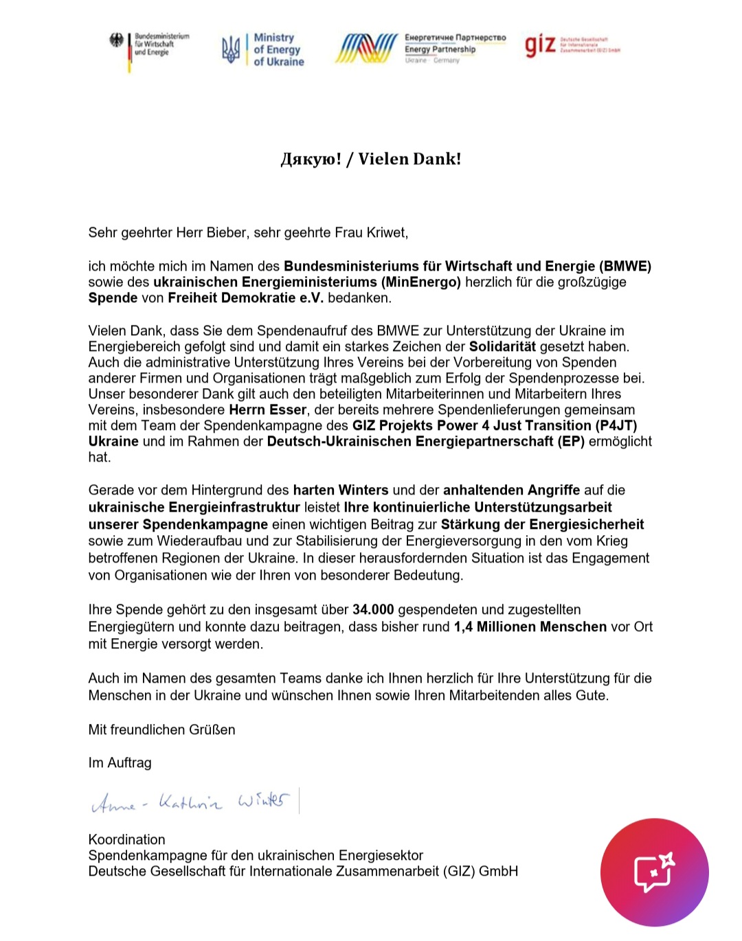 Unser Verein Freiheit & Demokratie sammelt Spenden, um gezielt Notstromaggregate zu beschaffen und dorthin zu bringen, wo sie dringend gebraucht werden. Jeder Euro hilft, konkrete Hilfe zu leisten – unmittelbar, greifbar, wirksam.